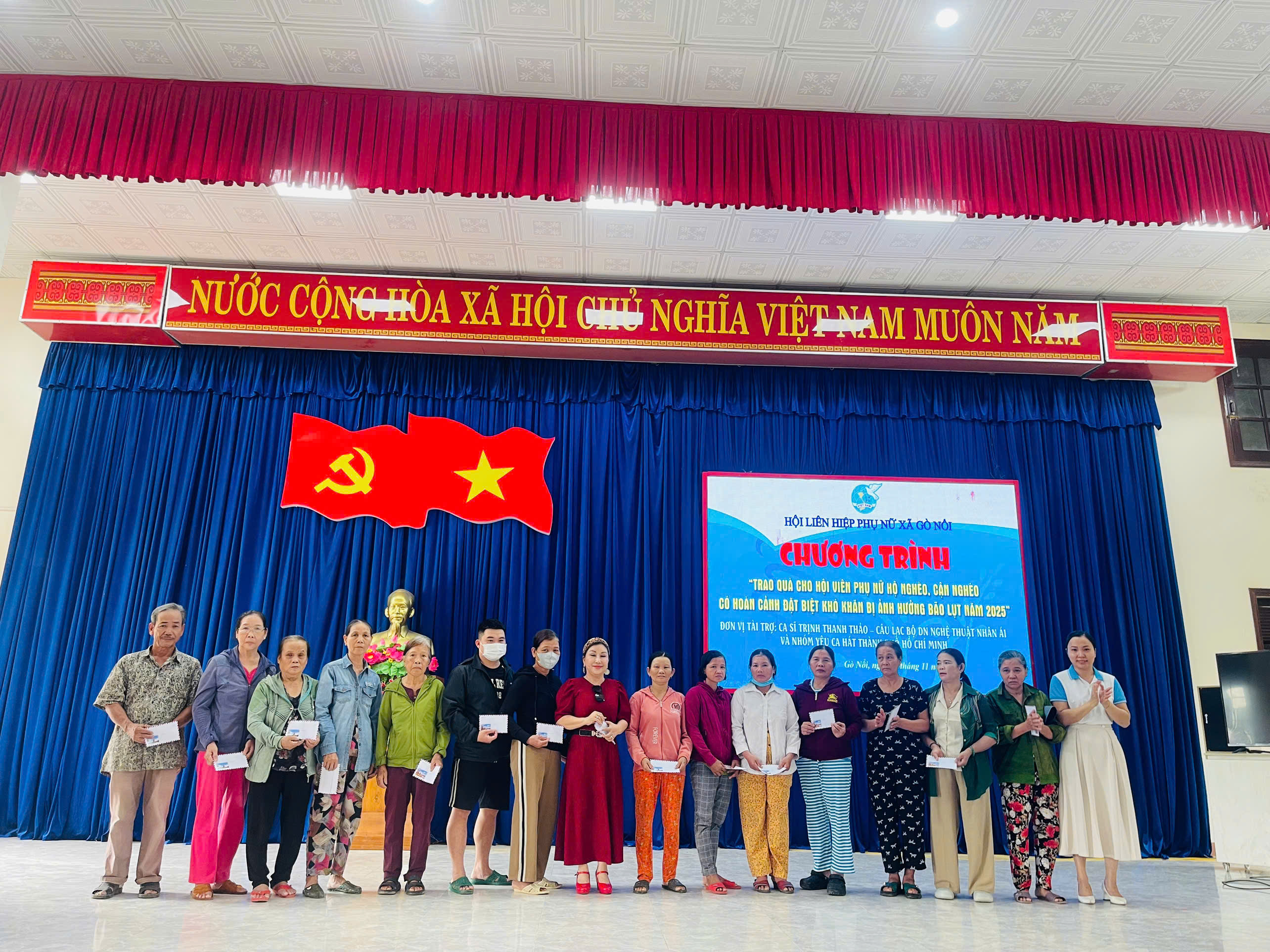 Trong đợt mưa bão vừa qua, nhiều hộ dân tại địa phương bị thiệt hại nặng nề về tài sản, nhà cửa và sinh kế. Hội LHPN xã Gò Nổi đã vận động Ca sĩ Trịnh Thanh Thảo, CLB DN Nghệ thuật – nhân ái và nhóm yêu ca hát thành phố Hồ Chí Minh tổ chức chương trình trao quà cho bà con nhân dân, hội viên phụ nữ, hộ nghèo, cận nghèo, có hoàn cảnh đặc biệt khó khăn bị ảnh hưởng đợt bão lụt năm 2025. Tại chương trình Hội đã trao 100 suất quà, mỗi suất 500.000 đồng cho 100 bà con nhân dân, hội viên phụ nữ nghèo, cận nghèo, đặc biệt khó khăn trên địa bàn xã bị thiệt hại sau đợt lũ lụt vừa qua, trị giá 50 triệu đồng