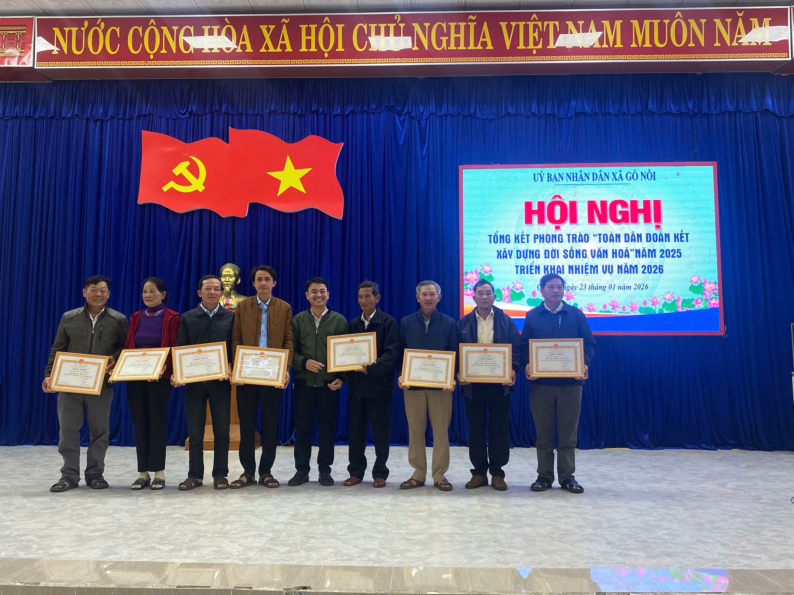 Nhân dịp này, UBND xã Gò Nổi đã công bố quyết định công nhận và khen thưởng các tập thể, cá nhân đạt danh hiệu văn hóa tiêu biểu năm 2025, tạo động lực thúc đẩy phong trào tiếp tục phát triển sâu rộng, bền vững trong năm 2026 và những năm tiếp theo.
